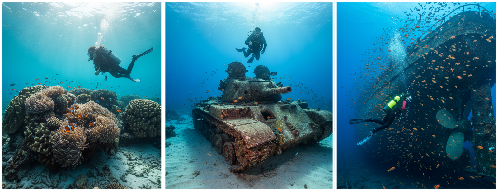 - Dive among the Red Sea’s pristine coral reefs and famous artificial dive sites.